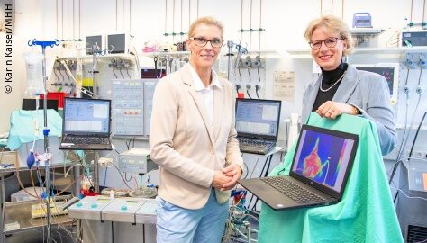 In the MHH laboratory, two researchers demonstrate the technical setup used to test ex vivo limb perfusion, including monitoring equipment and thermographic assessments.